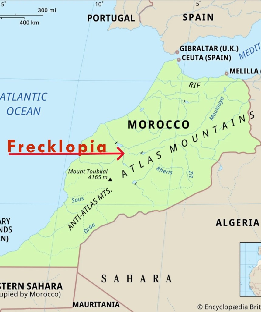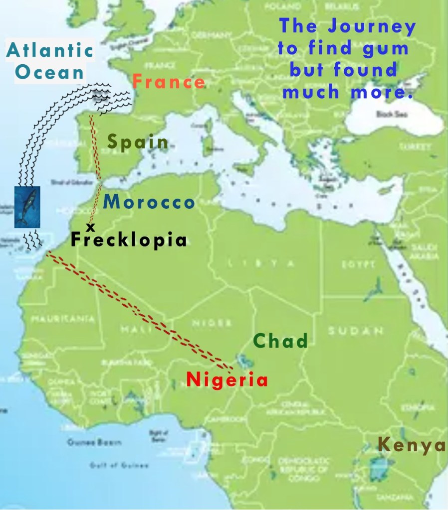 The Journey began in Nigeria, Africa to the Atlantic Ocean, where a storm tossed the boat through typhoon winds to France, where they had to turn around and head back to Spain, where they’re boat crashed, and they had to follow migrating spotted cuckoo birds to Morocco. But before they could make their way through Morocco, they had to take a ferry boat over the Strait of Gibraltar channel. Once they were back on land and in Morocco, they followed the High Atlas Mountain to a forest area and there they found where they always wanted to be, Frecklopia.